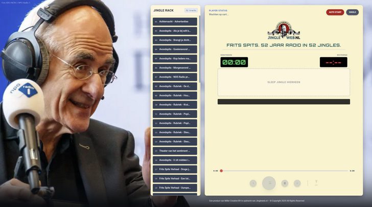Frits Spits (77) presenteert zaterdag 27 december voor het laatst ‘De Taalstaat’ op NPO Radio 1. Daarmee komt na 52 jaar een einde aan zijn indrukwekkende radiocarrière. Ter gelegenheid van dat afscheid heeft Jingleweb 52 jingles uit zijn radioloopbaan verzameld en ondergebracht op een speciaal daarvoor ontwikkelde website. “De taal- en radioman in hart en nieren laat na 52 jaar een radio-oeuvre achter van ‘heb ik jou daar’,” zegt Benno Roozen van Jingleweb. “Een radiomaker als Frits Spits verdient een blijvend Spitsbeeld. Met dit initiatief schenken we hem een digitaal eerbetoon.” Eerder deze week kreeg Frits bij de talkshow Pauw & De Wit ook de Zilveren Fonograaf overhandigd. Hij is de 27ste ontvanger is van deze onderscheiding van het NVPI, de brancheorganisatie voor de Nederlandse film- en muziekindustrie.