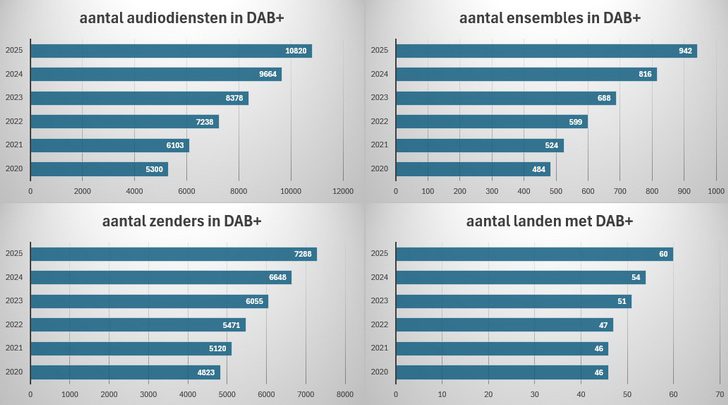 In 60 landen, waarvan 35 in Europa (37 als je Turkije en Azerbeidzjan meerekent tot het Europese continent), waren op het einde van 2025 samen 942 DAB+-ensembles in de ether. Dat zijn 126 ensembles en zes landen meer dan op het einde van 2024. Het aantal radioproducten in de digitale ether (DAB en DAB+) steeg van 9.664 naar 10.820 (+1.156). Dat is iets minder dan de 1.286 audiodiensten die er in het recordjaar 2024 bijkwamen. Vooral in de eerste helft van 2025 leek de groei te vertragen tegenover de vorige jaren, maar in de tweede helft was er nog een forse inhaalbeweging (ruim 800 nieuwe stations in de laatste zes maanden). In zendtoestellen uitgedrukt zijn er vandaag 7.288 digitale zenders in band III, 640 meer dan een jaar geleden. Dat komt neer op een dagelijkse activering van 1,75 zenders en dat is wél opnieuw een record. Tot slot steeg het aantal actieve datadiensten (EPG/SPI, TPEG) van 306 naar 326. Nog een leuk weetje om mee uit te pakken op uw komende nieuwjaarsrecepties: op precies vijf jaar tijd verdubbelde het aantal radiostations op DAB+ van 5.300 (eind 2020) naar 10.820. Alle cijfers zijn afkomstig van de openbare teller van dablist.org (onderdeel van fmlist.org) die bestaat sinds 2020.