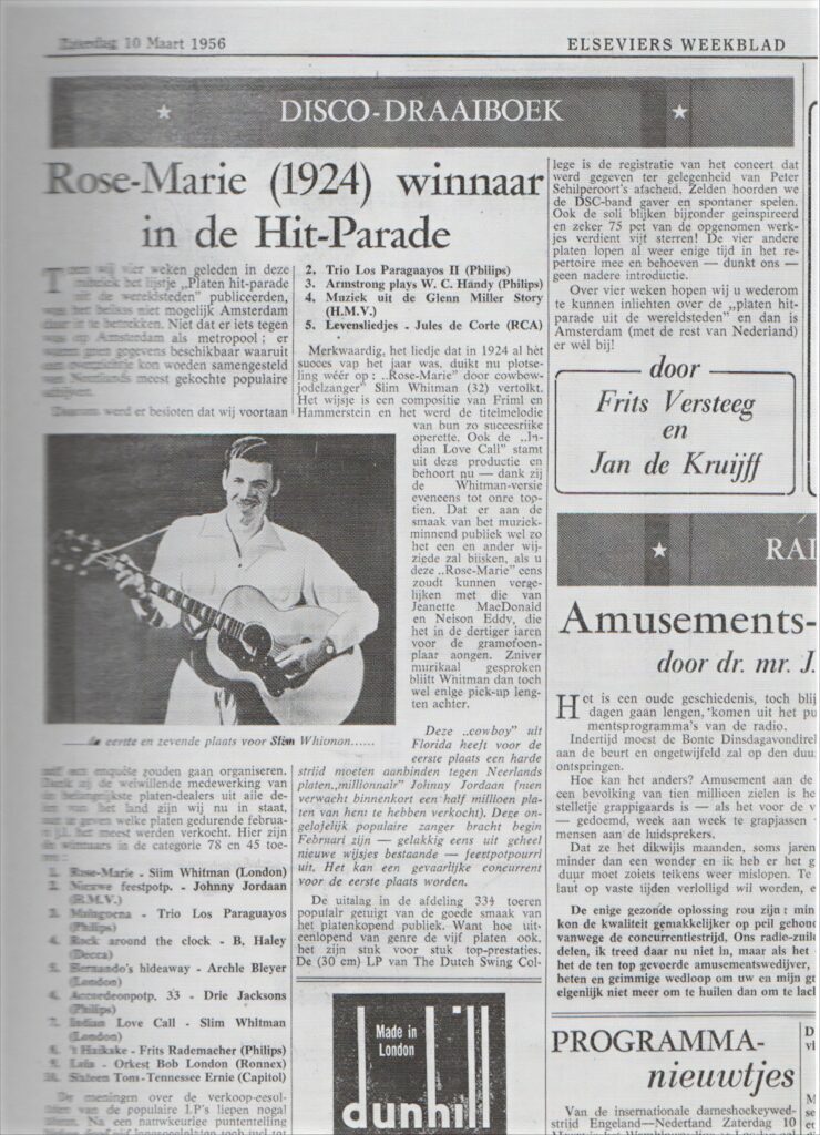 Het is vandaag, 10 maart, exact 70 jaar geleden dat in Nederland voor het eerst een echte hitlijst werd gepubliceerd. Die verscheen op 10 maart 1956 in Elseviers Weekblad. Het idee was afkomstig van redacteuren Frits Versteeg en Jan de Kruijff. Zij publiceerden eerder al hitlijsten uit Londen, Parijs en New York, maar besloten in 1956 ook maandelijks een Nederlandse top 10 samen te stellen. Omdat er nog geen centrale verkoopstatistieken bestonden, verzamelden ze zelf verkoopgegevens van platenzaken in Amsterdam en baseerden daarop hun rangschikking. In de eerste top 10 (van 78- en 45-toerenplaatjes) stond de jodelende countryster Slim Whitman op nummer 1 met “Rose Marie” én op nummer 7 met “Indian Love Call”. Daarnaast was er ook een top 5 van de 33-toerenplaten. De bestverkochte elpee in februari 1956 was voor de Dutch Swing College Band met de live-opname van het afscheidsconcert van (klarinettist) Peter Schilperoort. De Elsevier-hitparade bleef verschijnen tot oktober 1960. Een overzicht van de alleroudste Nederlandse hitparades vind je hier.