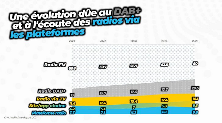 In Franstalig België is het luistervolume van digitale radio voor het eerst even groot als dat van FM, zo blijkt uit de achtste editie van de jaarlijkse Ipsos-bevraging in opdracht van maRadio.be, de koepel van Franstalige radiostations en de Waalse tegenhanger van Digitale Radio Vlaanderen. Het gaat om een bevraging bij 1.513 Franstaligen (van 26 november tot 30 december 2025). De belangrijkste cijfers worden echter geplukt uit de nieuwste CIM Audio Time, waaruit blijkt dat 50 procent van het luistervolume nu digitaal verloopt. In 2021 was dat nog 36 procent, tegenover 64 procent voor FM. Het luisteren via DAB+ groeide het afgelopen jaar van 17,7 naar 20,5 procent, terwijl het luisteren via online-platformen, websites of apps toenam van 16,5 naar 19,3 procent. Het aandeel van digitaal radioluisteren via televisie daalde dan weer van 12,4 naar 10,1 procent. Digitale radio bereikt inmiddels 79 procent van de Franstaligen, terwijl FM nog 67 procent haalt. Jongere luisteraars kiezen vaker voor digitale en online radio, terwijl 55-plussers vooral via de ether blijven luisteren. Het grotere plaatje blijft evenwel dat in het zuiden van het land radio sneller aan belang verliest dan in het noorden en dat de groei van digitale radio trager verloopt dan verwacht. De pdf met de volledige resultaten gaat die vaststelling overigens niet uit de weg.
