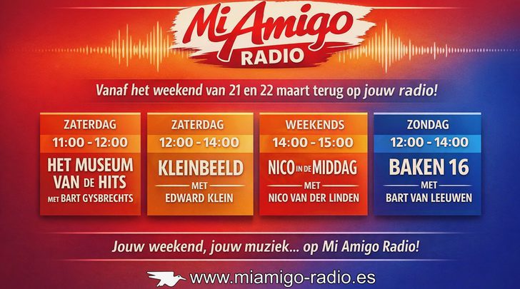 Mi Amigo Radio start vanaf zaterdag 21 maart met een nieuwe weekendprogrammering. Aanleiding is de terugkeer van deejays Edward Klein, Nico van der Linden en Bart Gysbrechts. Klein presenteert voortaan op zaterdagmiddag het programma Kleinbeeld, terwijl Van der Linden in het weekend te horen is met Nico In De Middag. Gysbrechts verzorgt op zaterdagochtend Museum van de Hits. Opvallendste wijziging is de terugkeer van Baken 16 op zondagmiddag (12-14 uur), met Bart van Leeuwen aan het roer, Marc Jacobs en Johan Visser aan dek en Maurice Bokkebroek in het kraaiennest. Daarnaast wijzigt het avondblok (18-19 uur) met op zaterdag staat Bokkebroeks Flashbackshow en op zondag een archiefuitzending onder de noemer Playa Tapes.