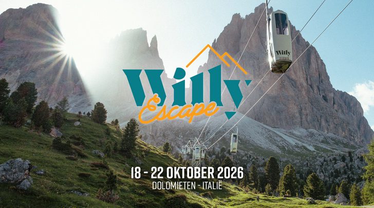 Willy pakt in oktober uit met een vijfdaagse luisteraarsreis naar de Italiaanse Dolomieten. Onder de noemer “Willy Escape” trekt de digitale rockradio van 18 tot 22 oktober naar Brunico voor een combinatie van live radio, concerten en outdooractiviteiten op bijzondere locaties in de bergen. Checken mee in: DAAN (solo), SONS, Dressed Like Boys, Jasper Steverlinck, Portland (solo), High Hi, Emmy d’Arc en Isolde Lasoen. Ook zijn er wandel- en fietstochten, comedy en een feestavond voorzien. Reisleiders van dienst – en met uitzendingen van ter plaatse – zijn Wim Oosterlinck en Roos Van Acker. Luisteraars kunnen de Willy Escape vanaf 2 april boeken via willy.radio/escape. Wie op kosten van Willy richting de Dolomieten wil trekken, luistert vanaf 27 april naar Willy om kans te maken op een trip voor vier personen.