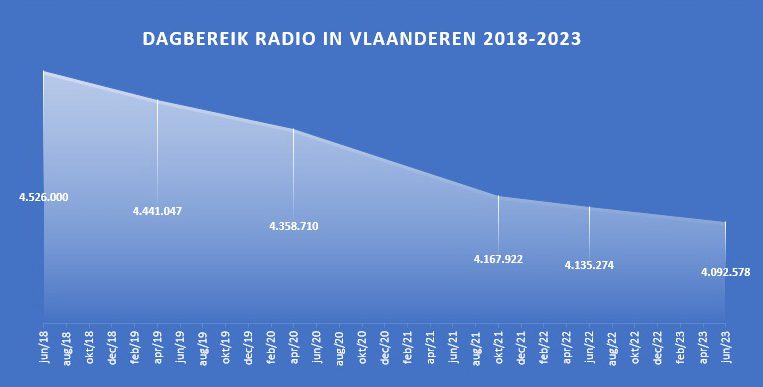 Als je de globale achteruitgang van radio koppelt aan de terugval van het marktaandeel de VRT (van 62 procent begin 2018 naar 53 procent begin 2023), dan is de terugval van de openbare omroep in feite nog dramatischer.