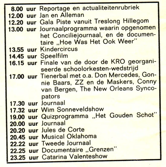 Die herdenking mondde uit in een televisiemoment dat zijn gelijke niet kende. Op 27 november van dat jaar zond men een ware tv-marathon uit. Zestien uur onafgebroken televisie, verzorgd door één en dezelfde omroep. Vandaag lijkt dat nauwelijks bijzonder – televisie is immers 24 uur per dag beschikbaar – maar midden jaren zestig was het aanbod beperkt, zowel in zenders als in zenduren. Juist daarom maakte deze dag zo’n indruk.
