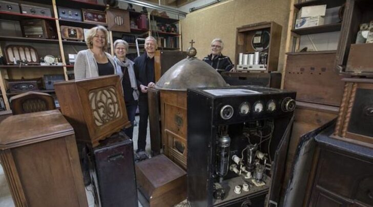 En zo staan ze op de foto. Vier mensen, een beetje verloren, een beetje trots, tussen apparaten die meer hebben gehoord dan wij ooit zullen zeggen. De radio’s kijken terug. De oude versterkers brommen zachtjes in zichzelf. Je ruikt de geschiedenis, niet als iets groots, maar als iets dat in alle spleetjes van de kast is gekropen en daar nooit meer uit wil. En ergens – ik weet het zeker – tikt er in dat hele pand nog een buisje. Heel zacht. Alsof Frans nog één keer zegt: “Niet weggooien. Wat kapot is, verdient soms meer liefde dan wat nieuw is.”