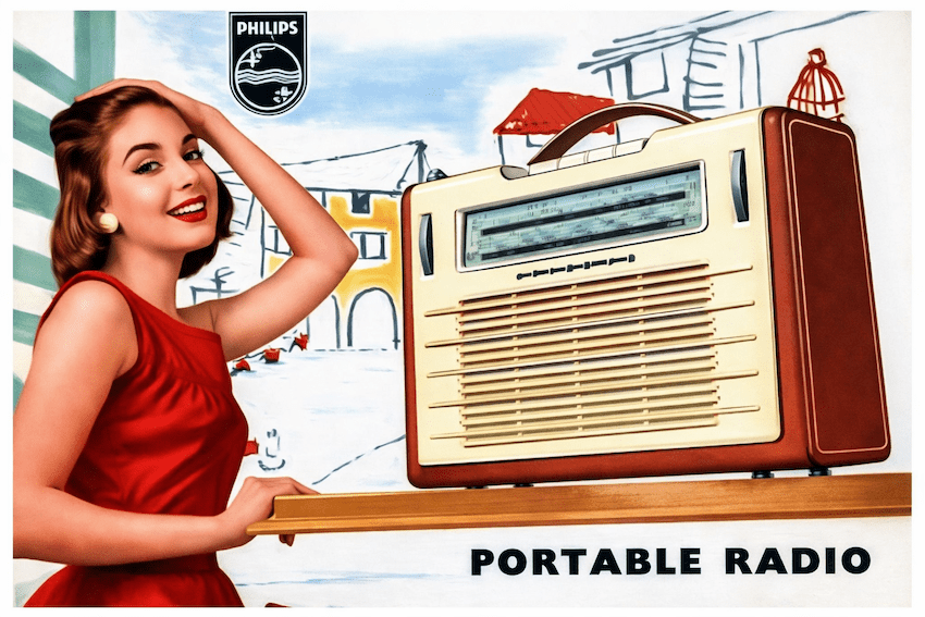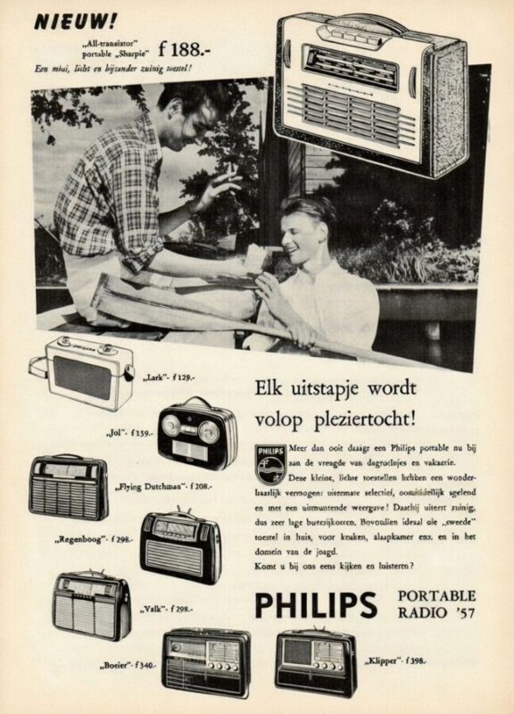 De eerste ‘portable’ radio die Philips op de markt bracht in 1957. Letterlijk een kanjer…, enkele kilo’s zwaar. Laten we eerlijk zijn, om deze radio te ‘dragen’ had je sterke polsen nodig. Wat de advertentie dus een beetje ‘dubbel’ maakte. Klein meisje, grote portable. Of misschien was het gewoon een geval van ‘grote marketingfantasie, kleine dosis realiteitsbesef’. In die tijd was ‘groots’ een synoniem voor ‘vertrouwen uitstralen’.