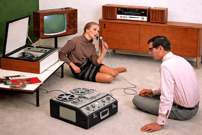 Dit was thuistheater vóór er sprake was van surround. Hier zat je niet in de muziek, je zat er letterlijk tussen. Kabels over de vloer, microfoon in de hand, knieën elegant gevouwen, rok op standje ‘net niet live-uitzending’. En toch… er zit iets ontroerends in dit tafereeltje. Er is geen applausknop, geen sms-stemmen, geen draaistoelen die dramatisch omklappen. Alleen twee mensen, een bandrecorder en de hoop dat ergens, iemand zal luisteren.