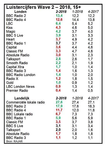 Net zoals in Vlaanderen, waar alles wat naast Antwerpen ligt, parking is, dit ook het geval in het UK. Er is London en dan de rest. Toch is ook daar BBC Radio 2 de populairste zender. Ochtenddeejay Chris Evans verloor luisteraars, maar is toch nog goed voor 9,03 miljoen zieltjes. De nieuwe middagshow met Simon Mayo en Jo Whiley begon pas in mei en kreeg bijgevolg slechts een gedeeltelijke meting. Ondanks de vele klachten trok het ‘drivetime’ programma 6,4 miljoen luisteraars. Stabiel met het eerste kwartaal.